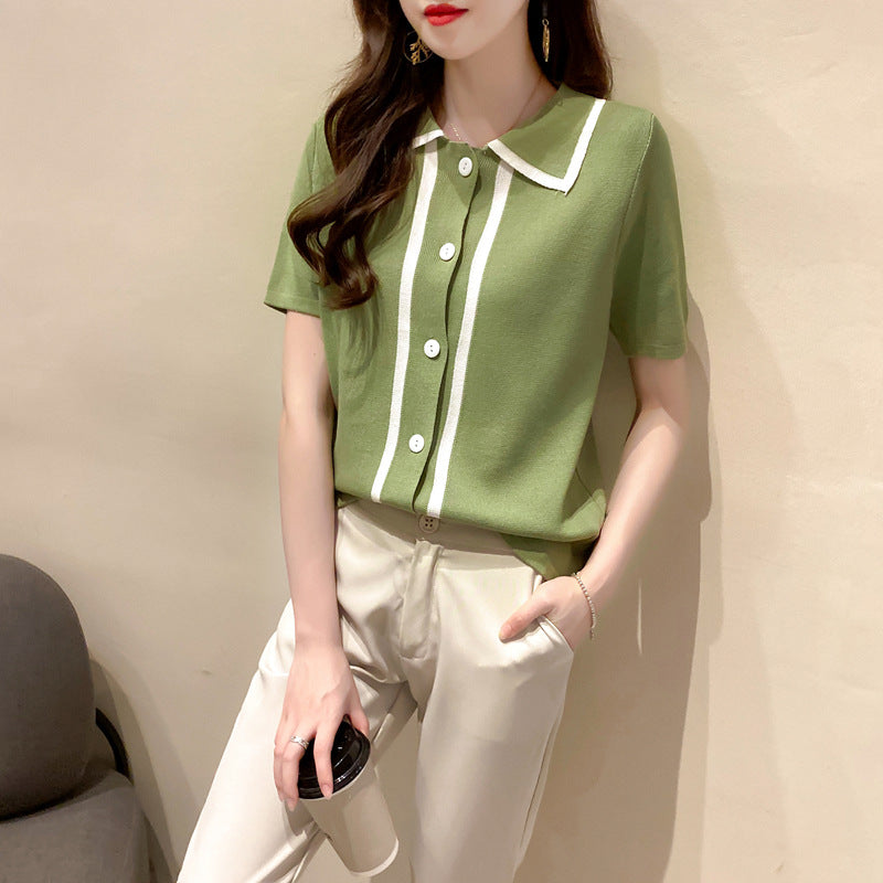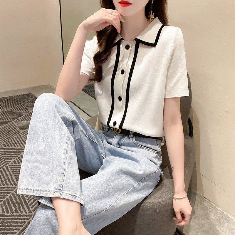 2020 summer new POLO collar ice silk knit short-sleeved T-shirt female INS tide loose tap bottom shirt tide