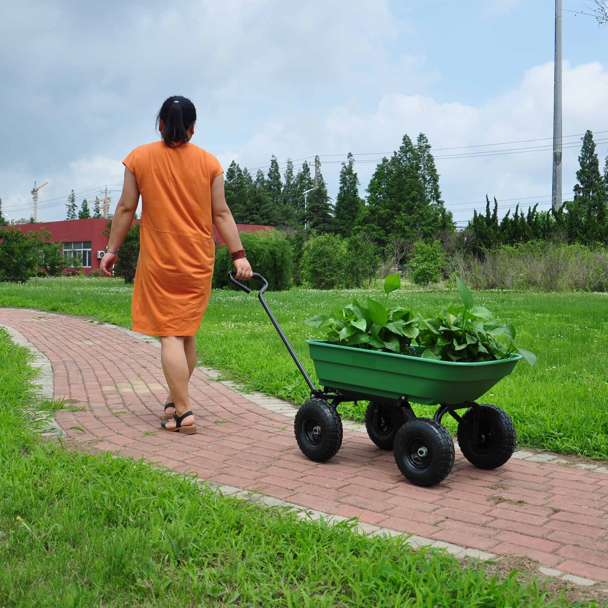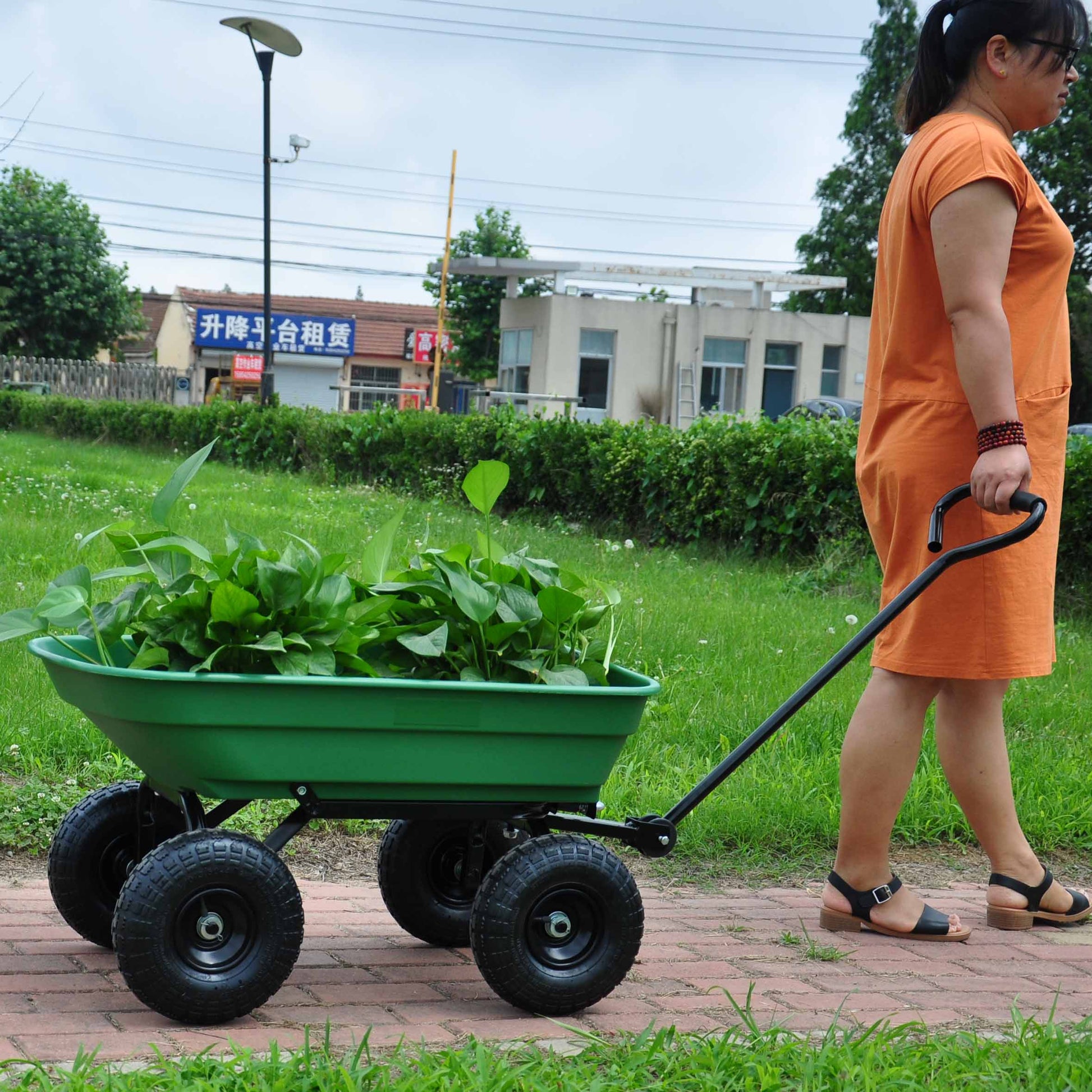 folding wagon Poly Garden Dump Cart with Steel Frame and 10-inPneumatic Tires, 300-Pound Capacity, Green