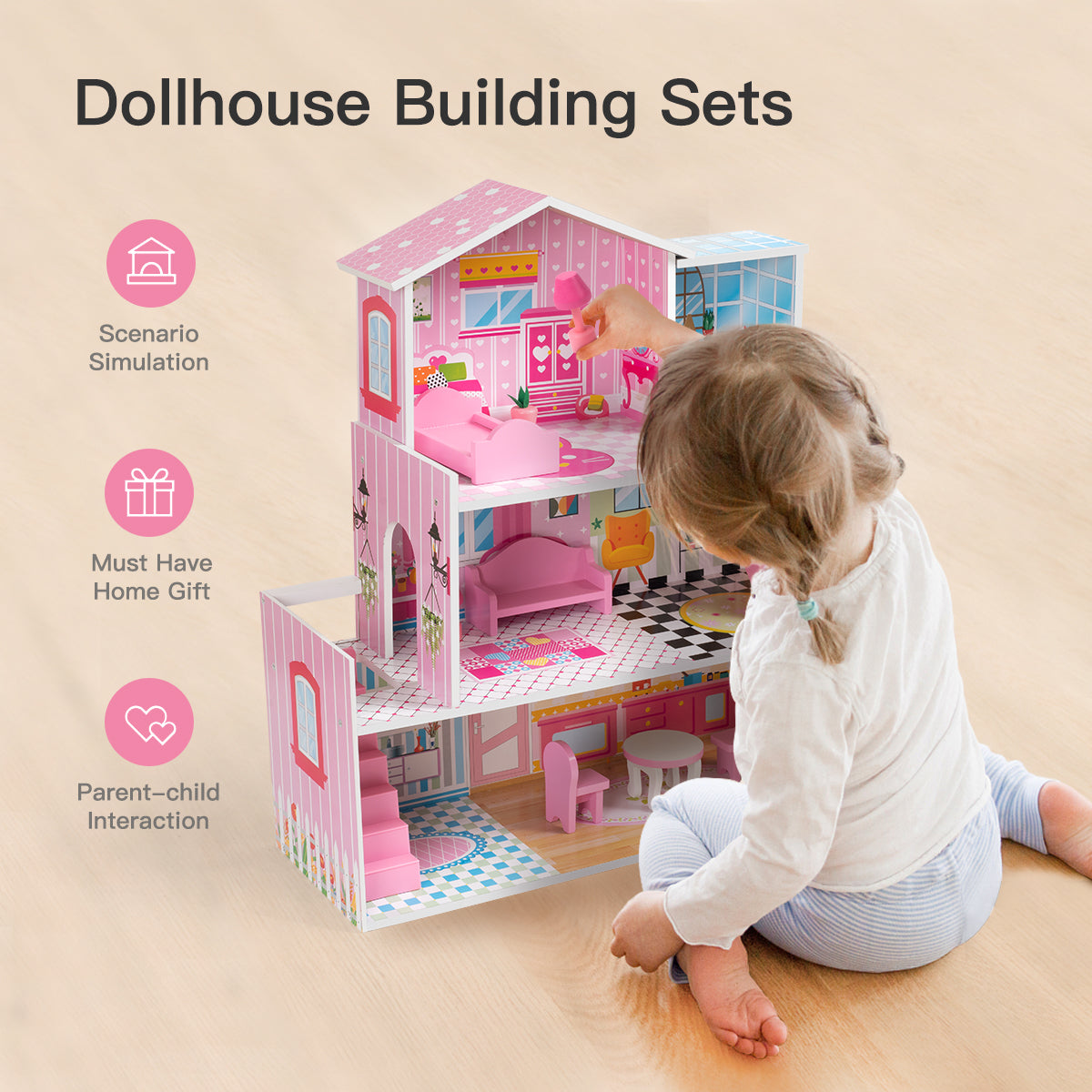 Wooden Dollhouse with Furniture, Doll House Playset for Kids