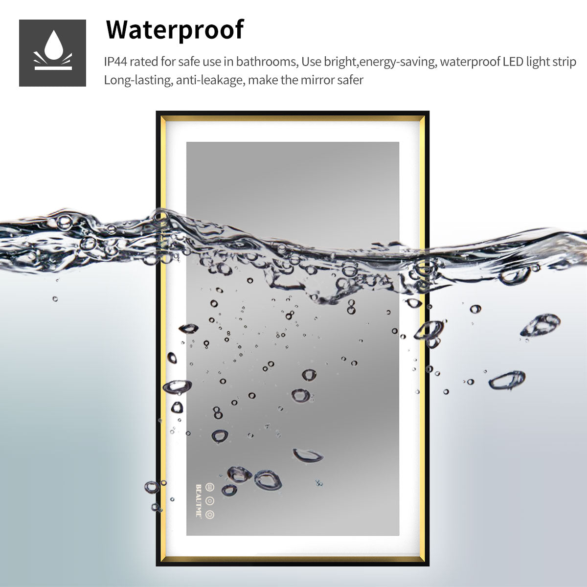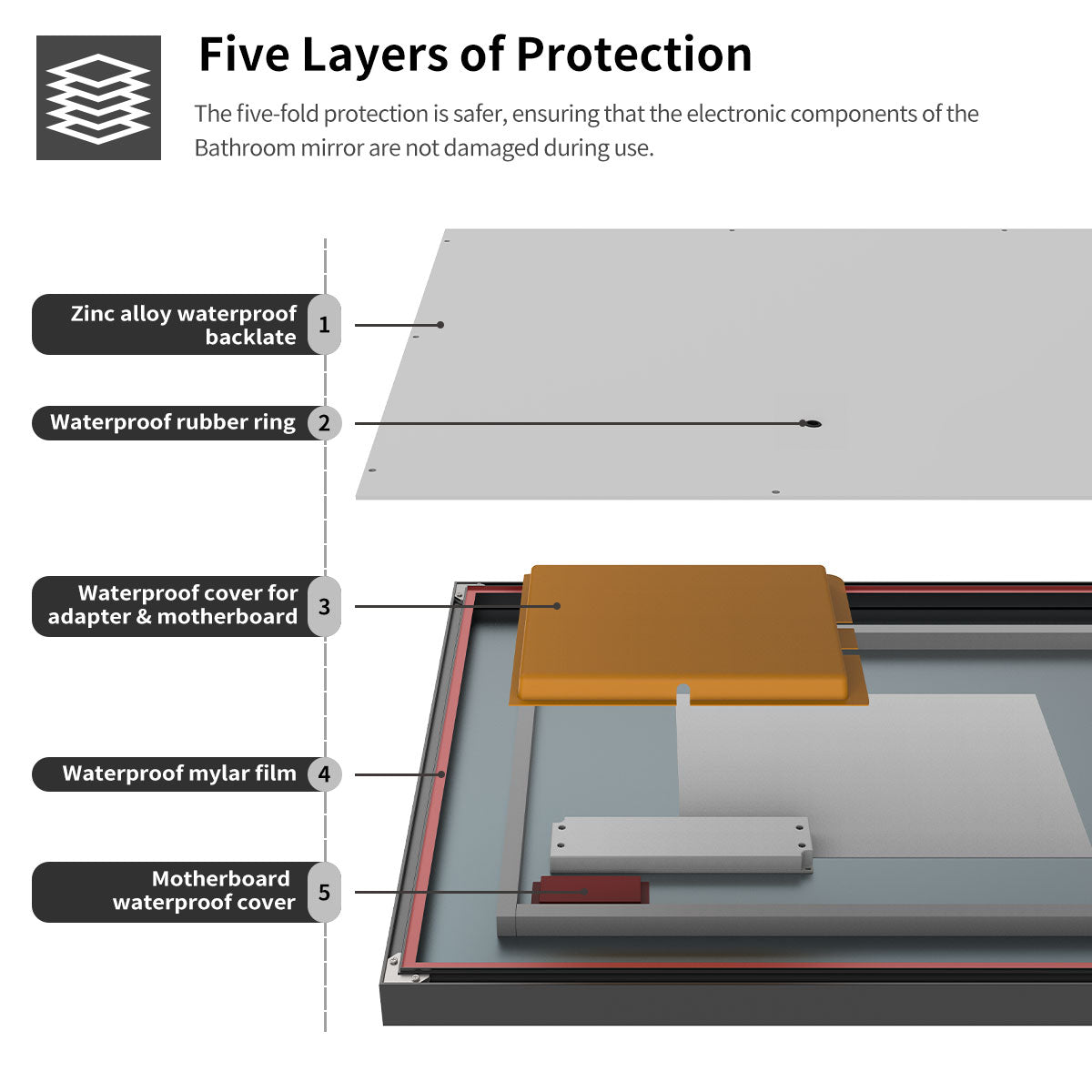 - 【Waterproof, Safe and Durable】IP44 waterproof grade, safe and durable to use. The five-layer protection on the back of the mirror is more secure and can ensure that the components of the bathroom mirror are not damaged during use. The waterproof LED strip has a leak-proof function and is safer to use.
