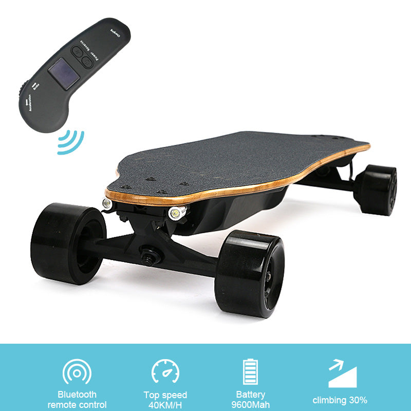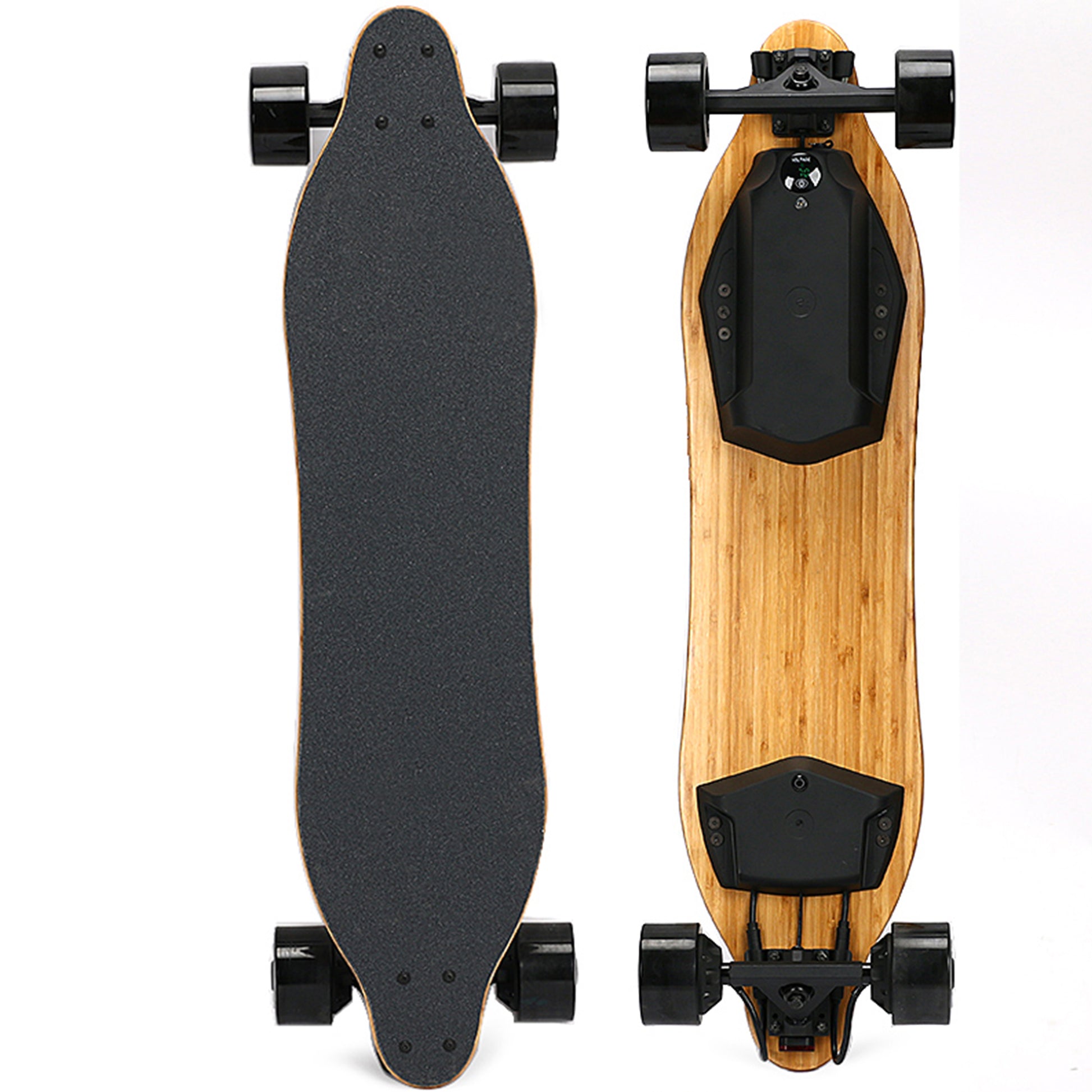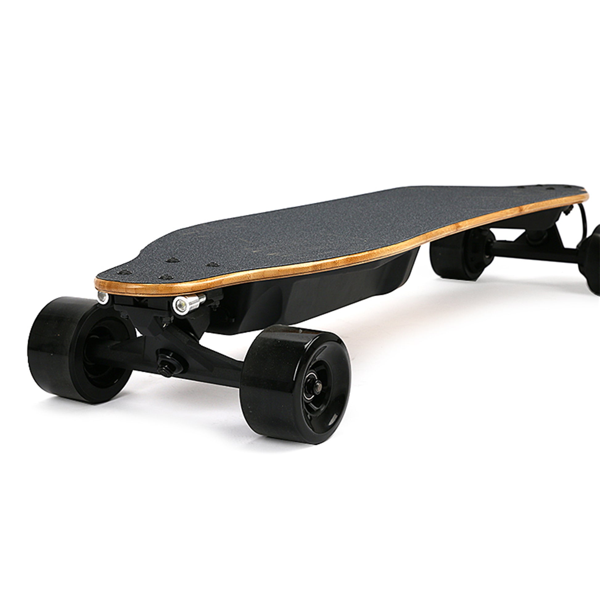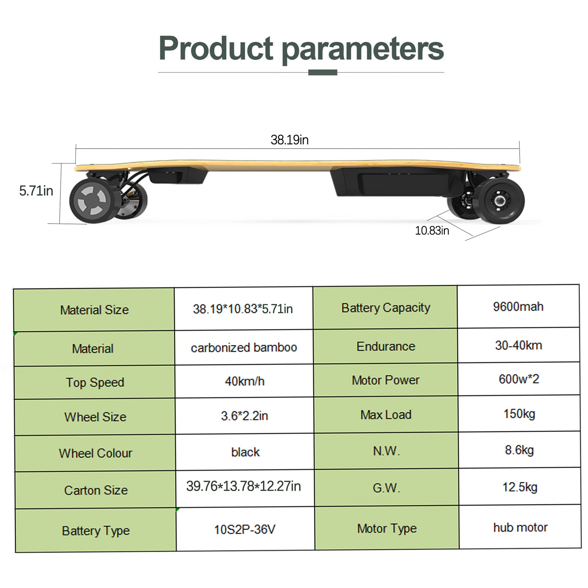 Electric Skateboard Basic Parameters : The ANZO longboards designed with dual wheel hub motor and 600W per motor. The skateboards reached a maximum speed of 25mph and climbed at a 30%. 9.6ah strong endurance battery pack,high-performance battery charging takes only 2-3 hours, 40 kilometers battery range.